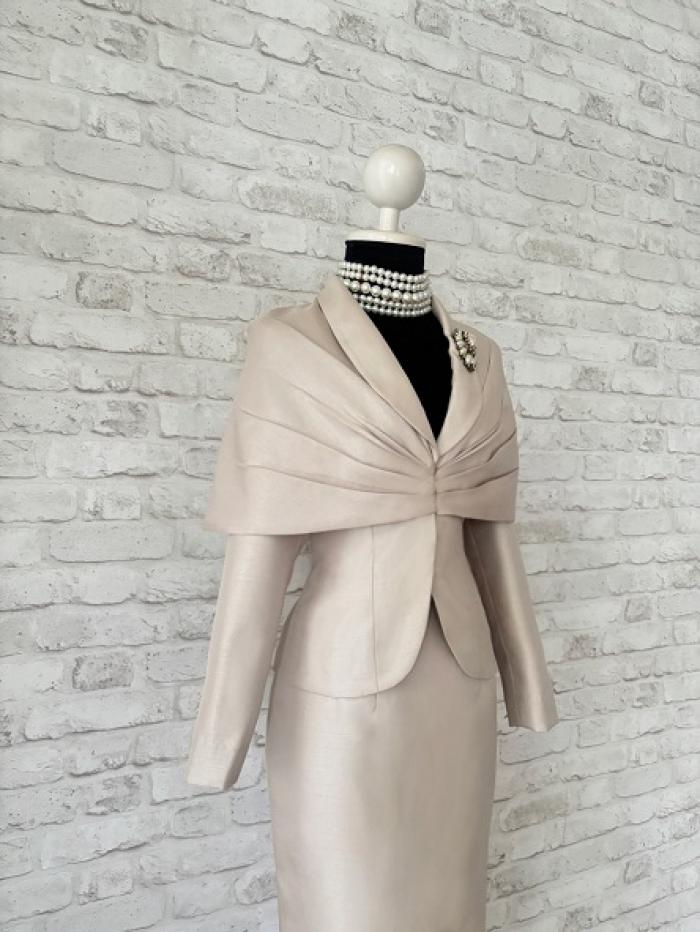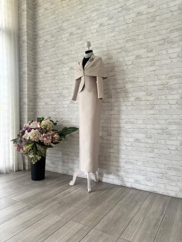 เสื้อผ้าไหม คอวีมีปกและมีเคปคลุมไหล่จับเดรปด้านหน้า แขนยาว สีครีม ใส่คู่กับกระโปรงยาวทรงสอบผ่าหลัง