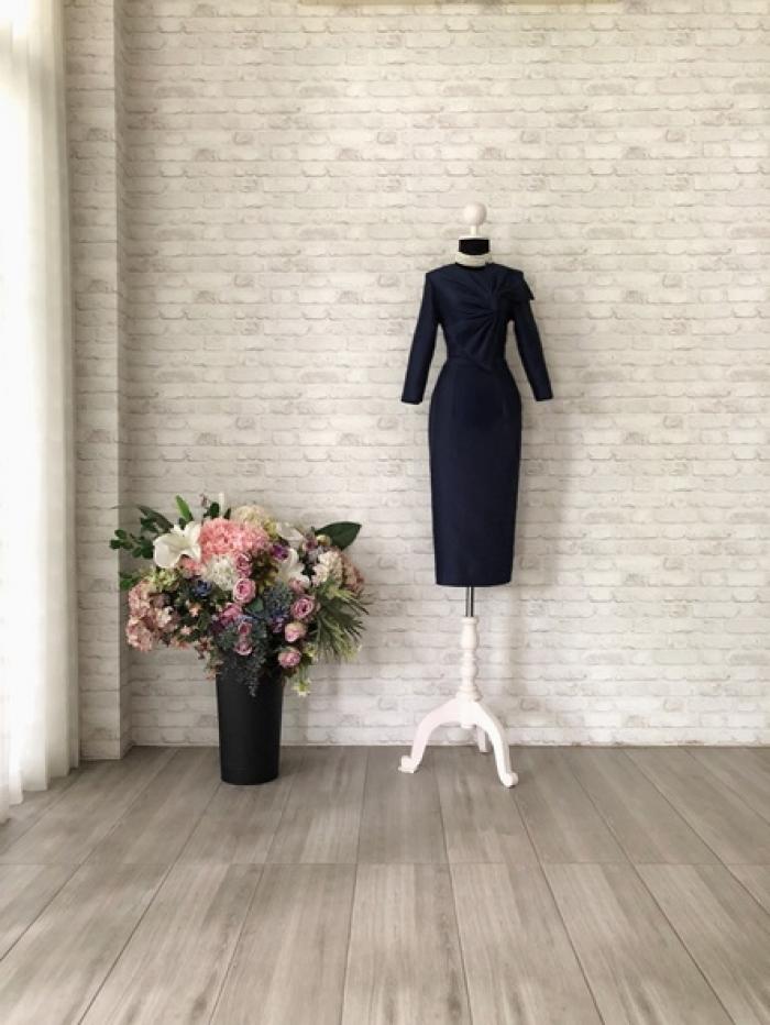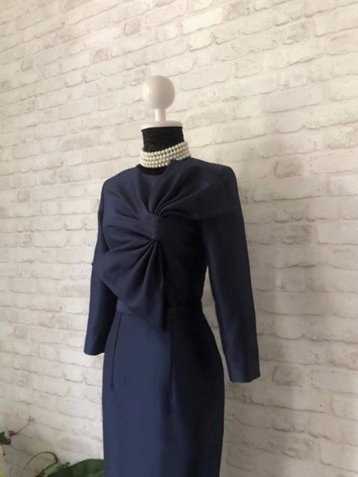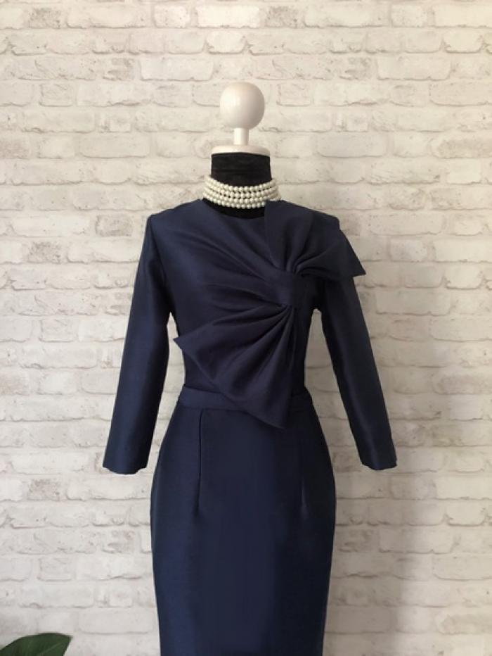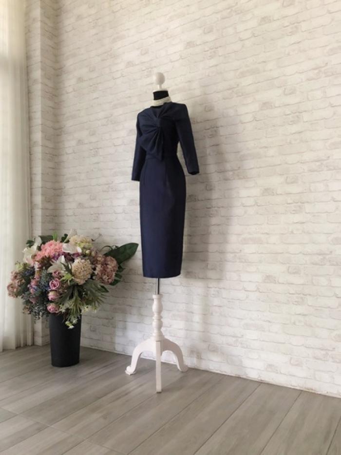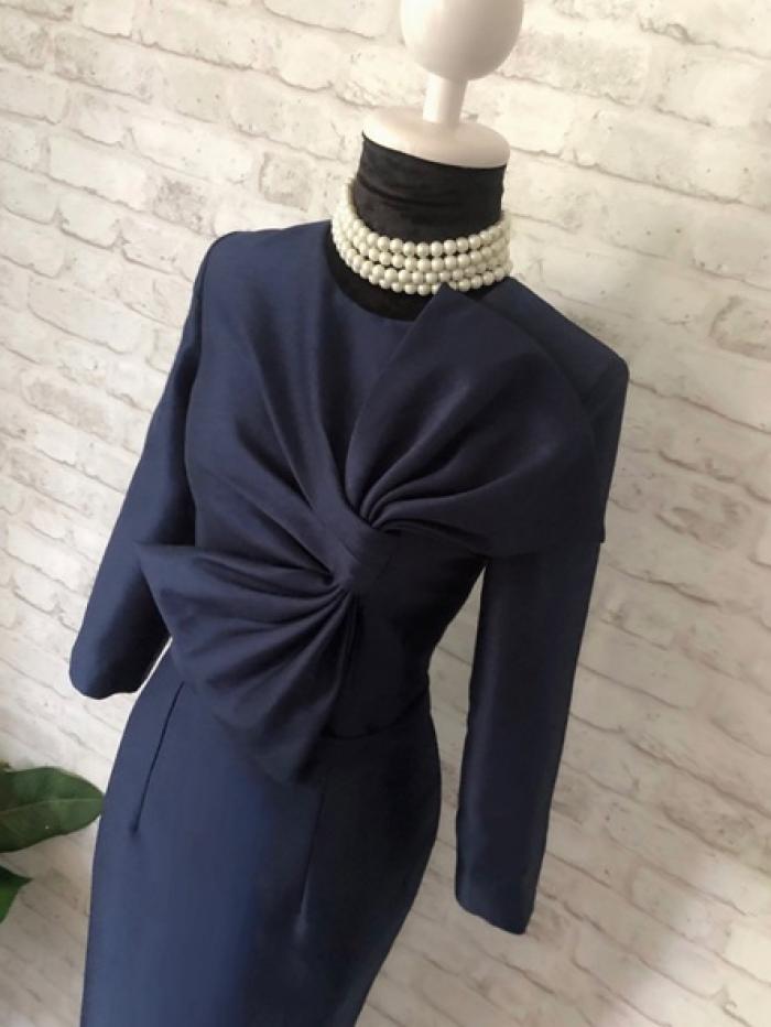 ชุดเดรสสั้น ทรงสอบเข้ารูป คอกลม แขนยาว จับเดรปเป็นโบว์ด้านหน้า สีกรมท่า